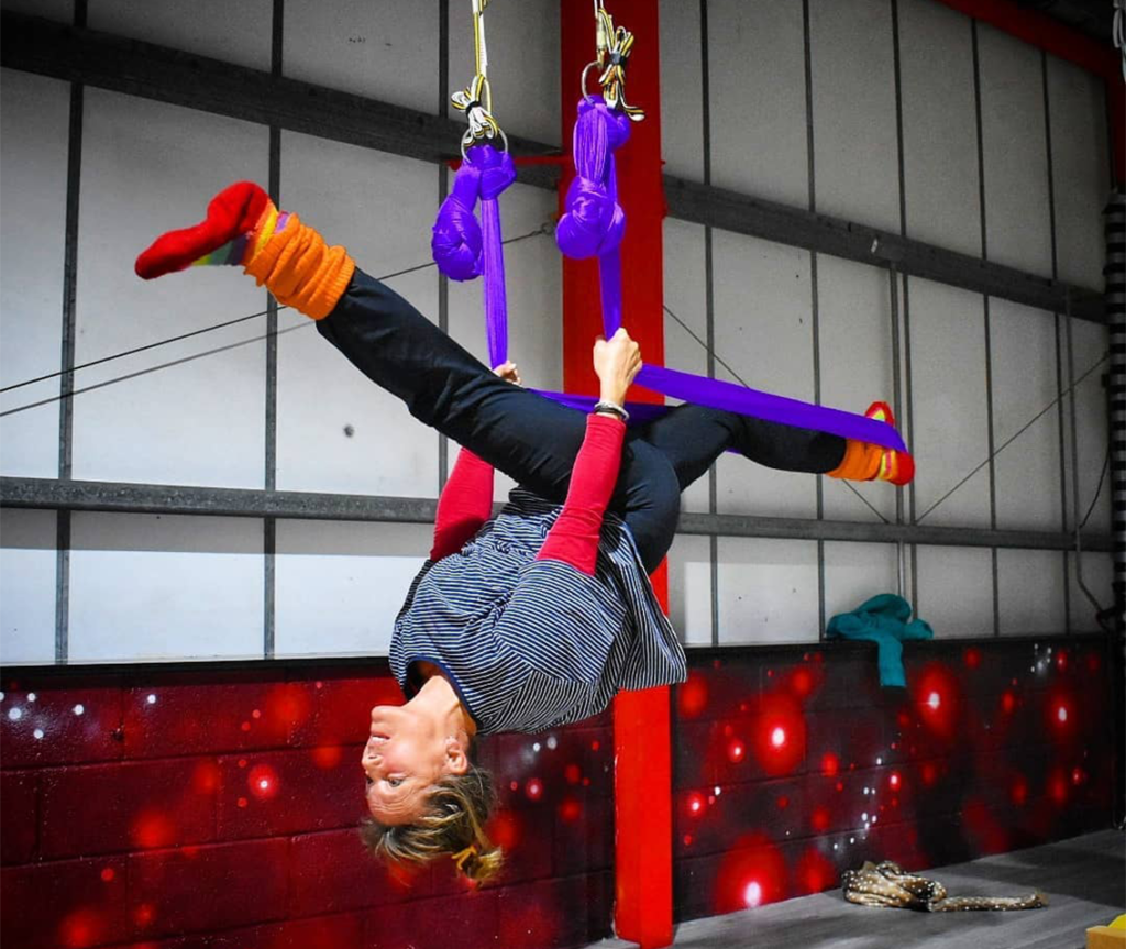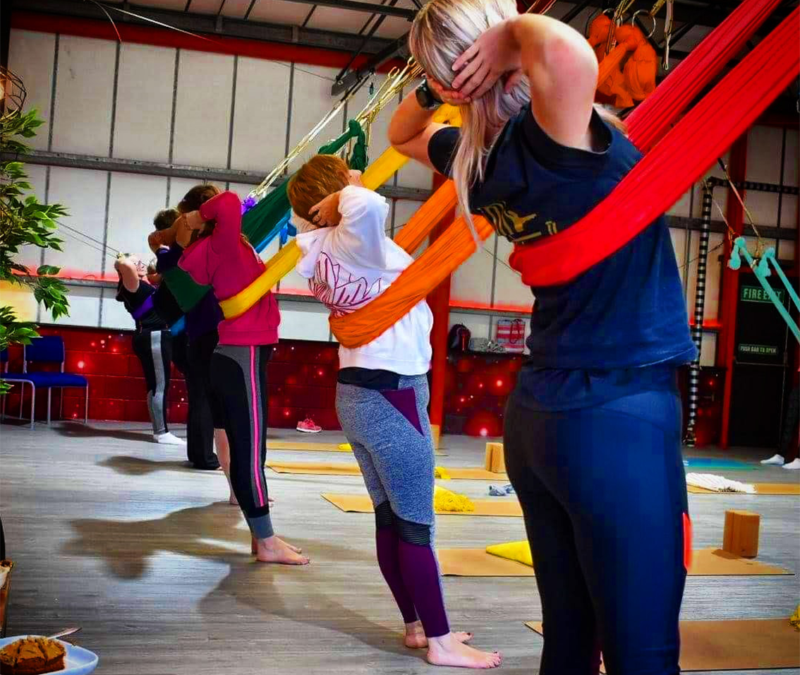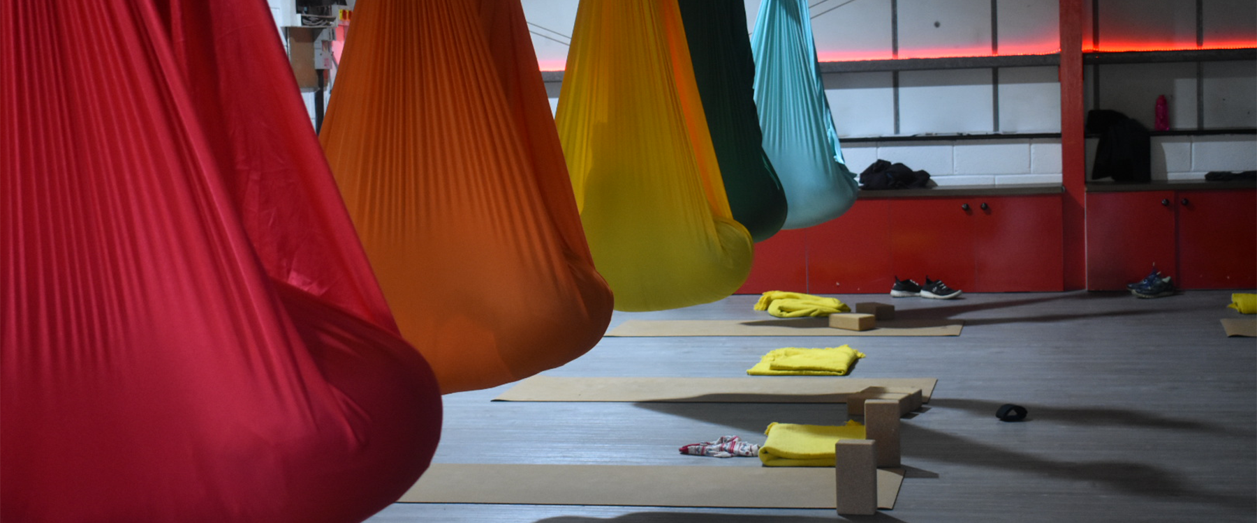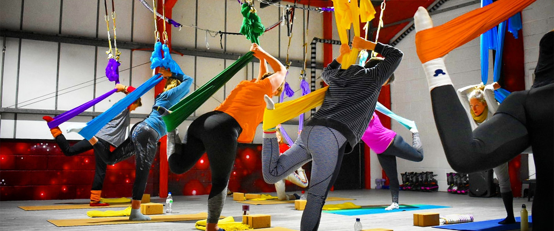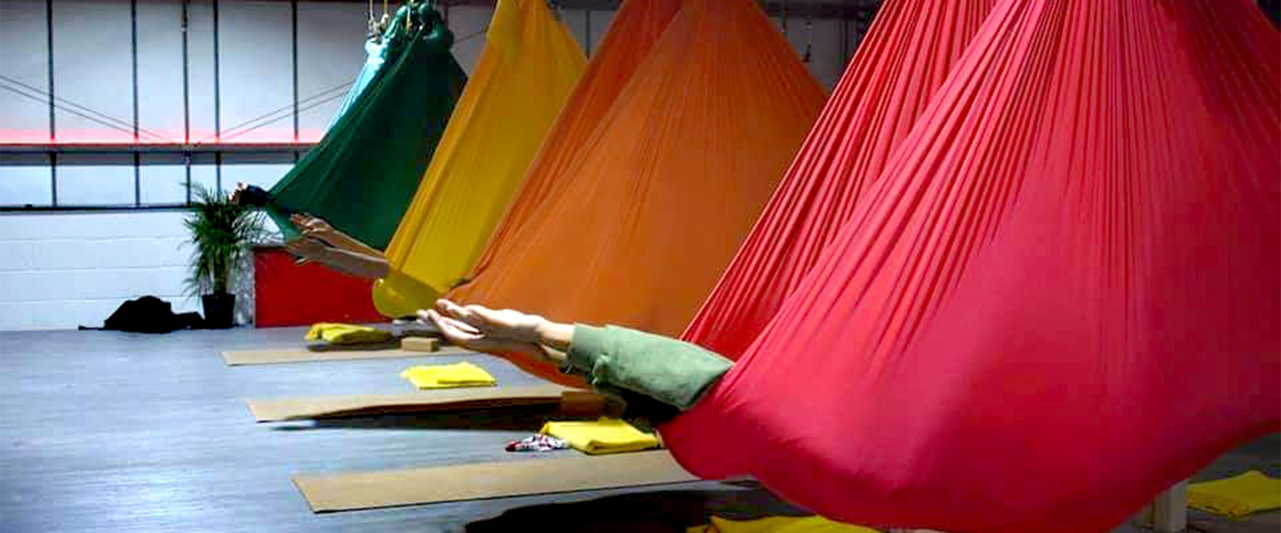 Aerial yoga uses a loop of aerial silk โ also called a yoga hammock or swing โ to reimagine or refine traditional yoga postures, whilst also drawing from aerial circus technique and vocabulary. AeroZen classes generally take the form of movement series, working with breath through different sequences of postures.
